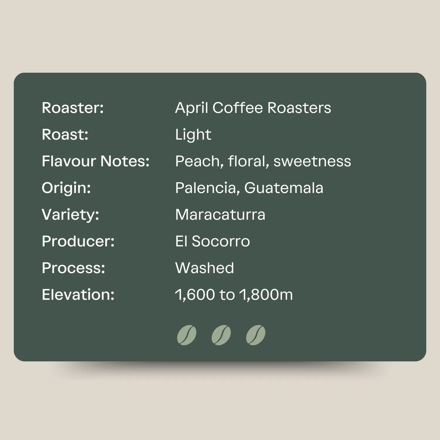 April’s roasting approach focuses on highlighting the natural qualities of the coffee, allowing the origin and variety to shine through in a clean and refined flavour profile.