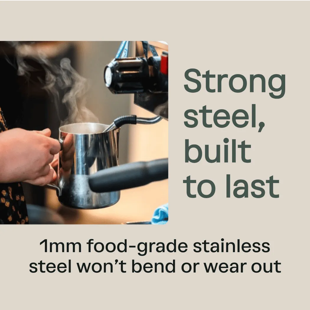 The Barista range of pitchers is made from 1mm thick 303 stainless steel. This gives the barista more time to control the milk steaming resulting in better-textured milk and more beautiful latte art, as well as amazing quality feel. The Rhino Pro Milk Pitchers have all been tested and are Certified Food Safe.