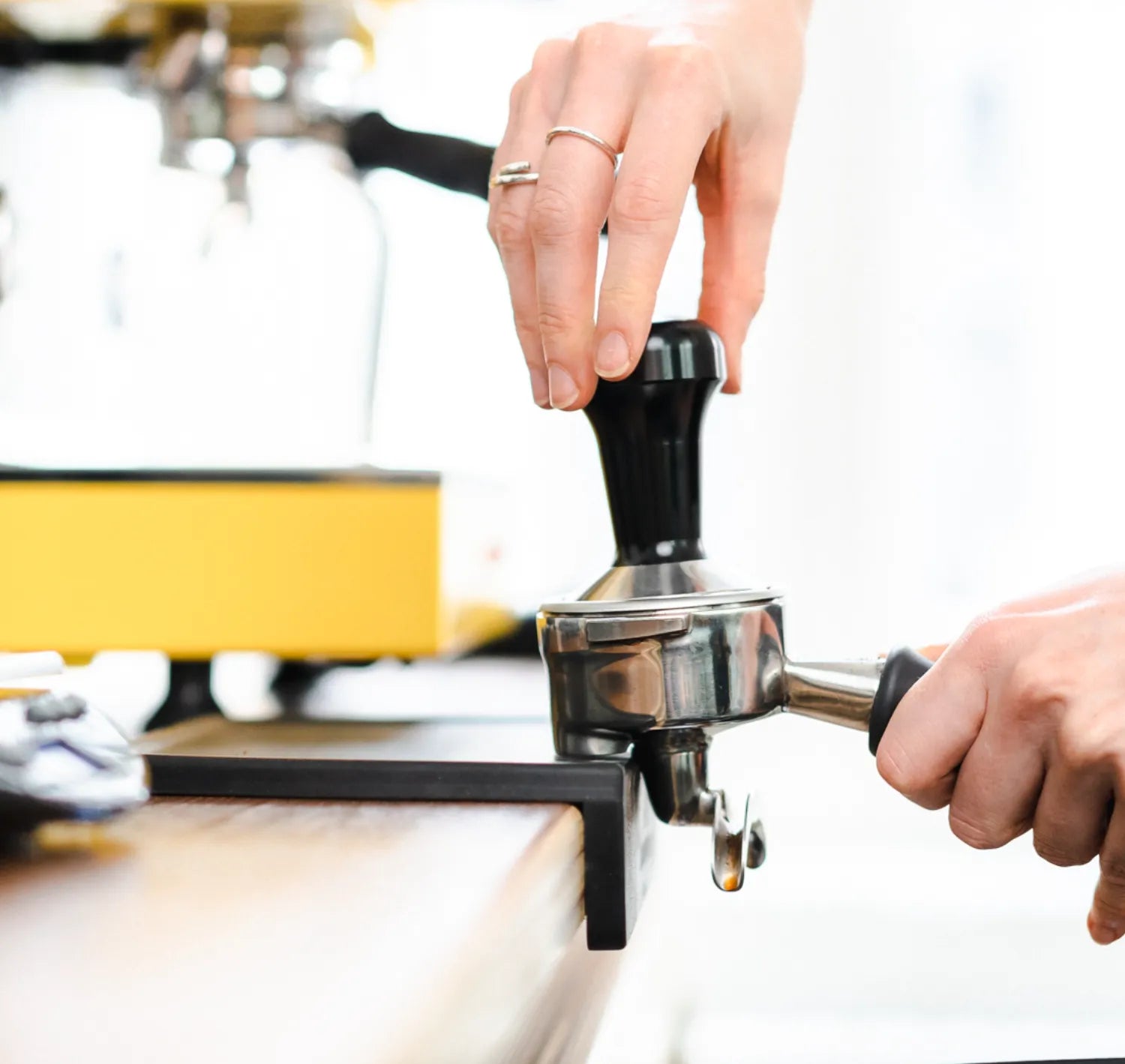 Espresso tamping, home espresso setups, café barista stations, portafilter protection, countertop protection